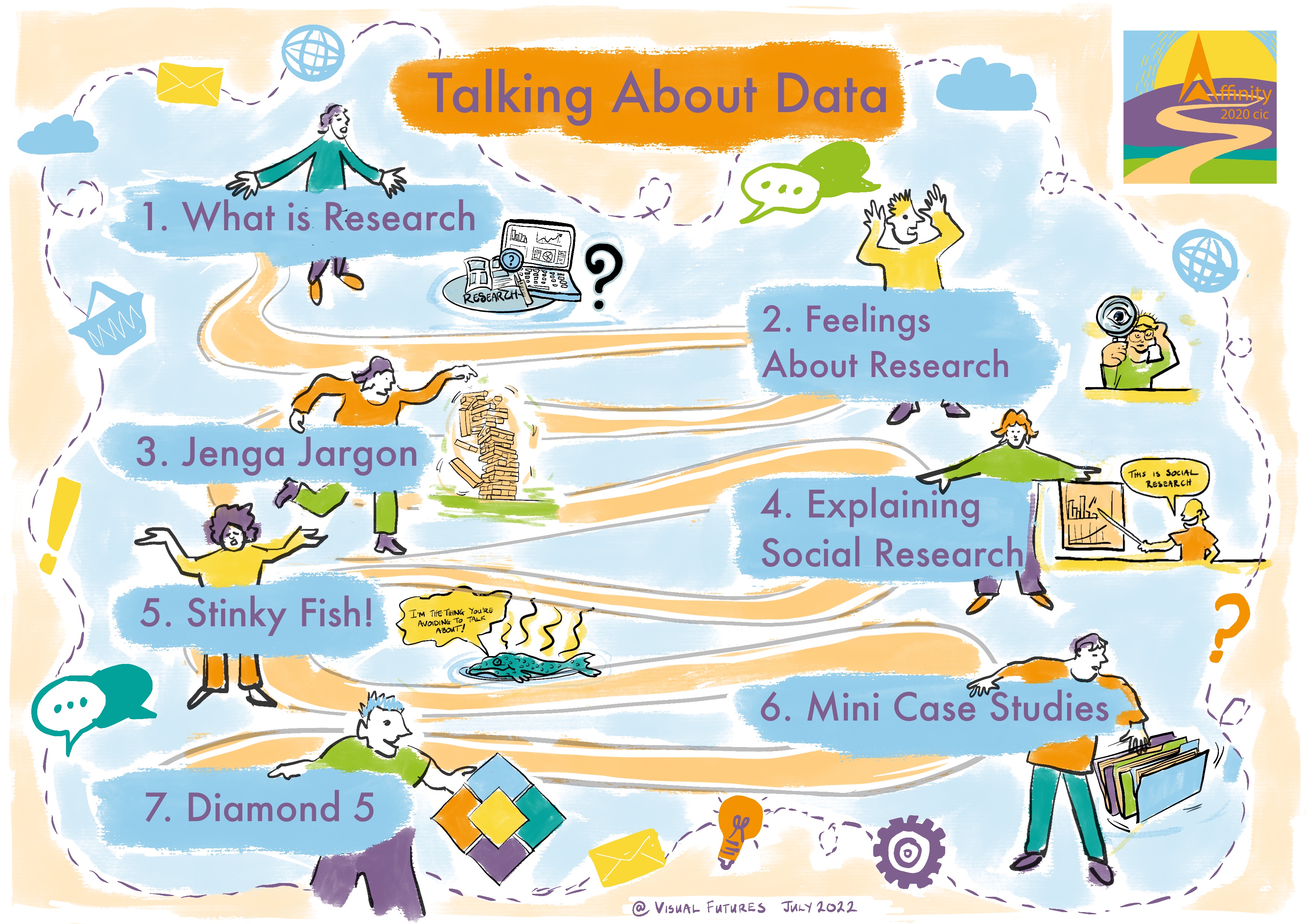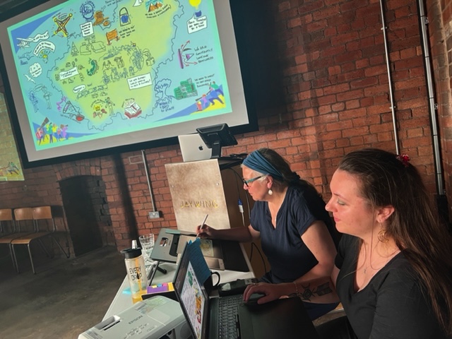 This is our ‘entry level’ and most straight forward of our services. We will attend your meeting or workshop, listen to the key points and themes and, in real time, translate these into representations which combine words with pictures. What we produce is a visual distillation of the presentation, including the key points, ideas and useful details. We may also include some of your audience’s feedback to the ideas, important questions or quotes.